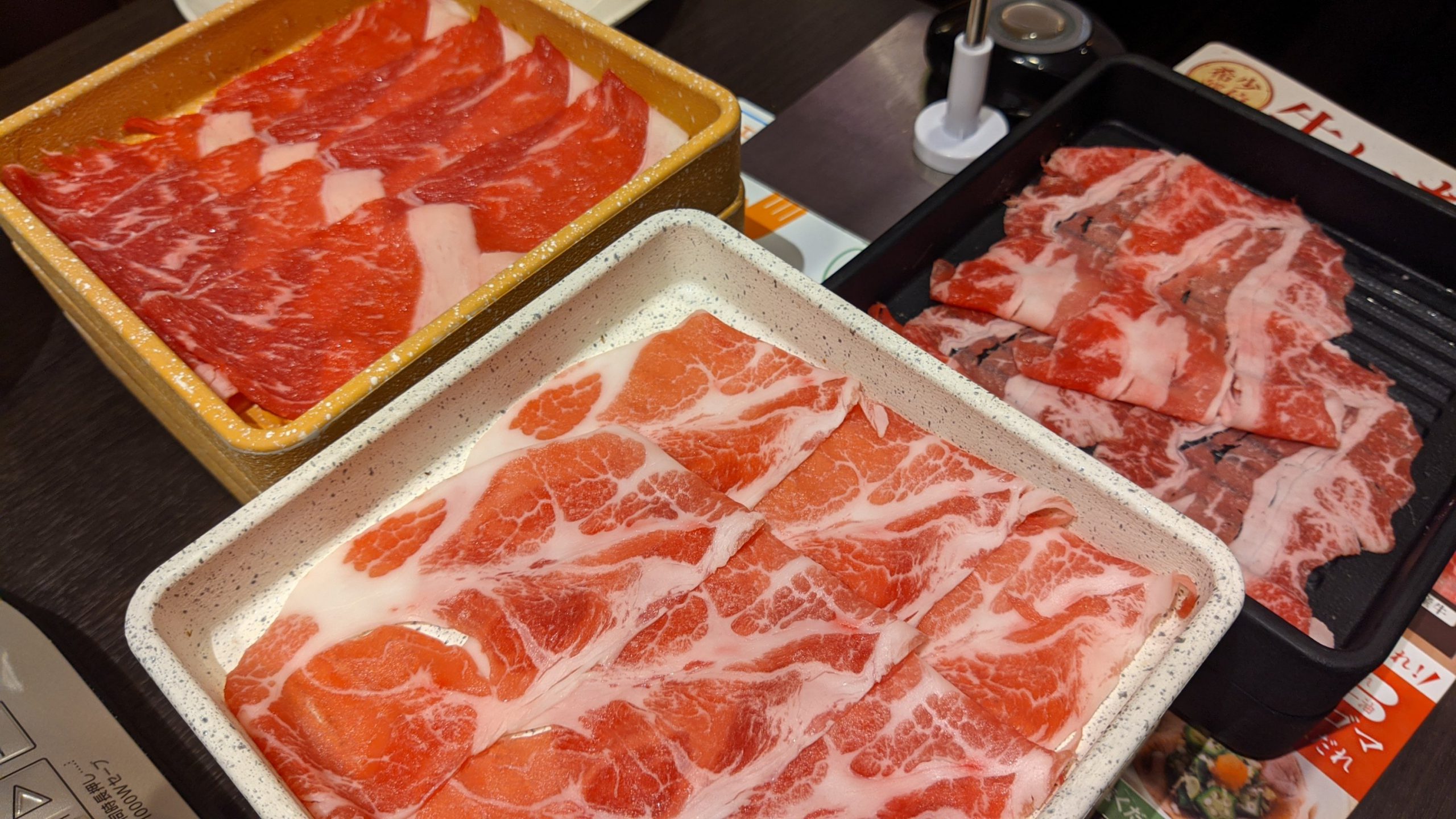 手前イベリコ豚、右牛カルビ、左牛イチボ、イベリコ豚が特におすすめの美味しさ